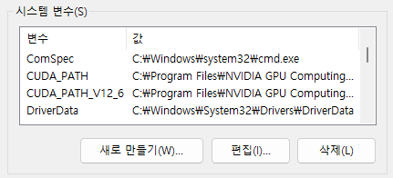 이제 환경변수로 들어가 CUDA 경로가 정상적으로 적용되었는지 확인합니다.